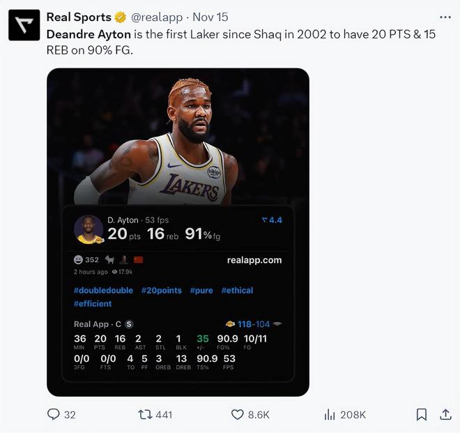 对阵鹈鹕的背靠背G1,艾顿36分钟,11中10拿到20分16篮板2助攻2抢断1盖帽,真实命中率90.9%,他成为2002年奥尼尔后首位命中率超过九成拿到20+15的球员。
